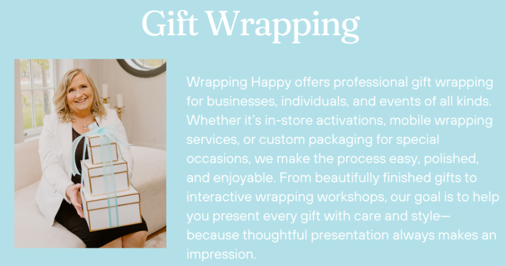 I was so extremely happy with how my presents were wrapped! Pleasant and professional, there was a genuine interest in asking what my preferred colours were and within a few short minutes later, I was handed back the presents wrapped so nicely! I'm a big believer that it's all about the presentation and I'll be more than pleased to come back to 'Wrapping Happy' for future gift wrapping needs. Also very reasonably priced.